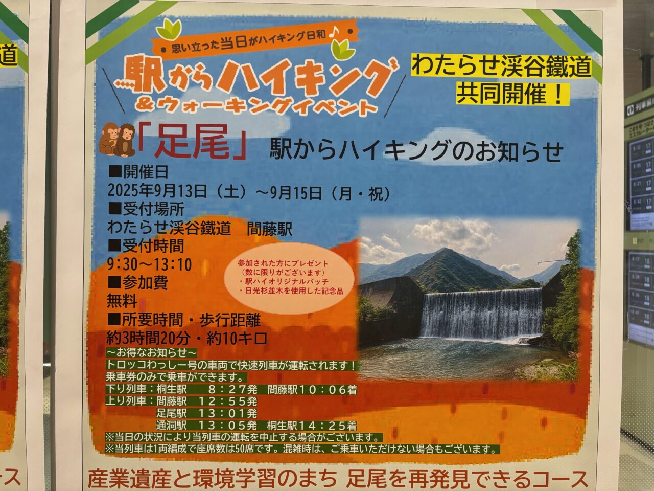 2025年9月13日(土)~15日(月・祝)、日光市足尾で『駅からハイキング&ウォーキングイベント』が開催されることがわかりました。