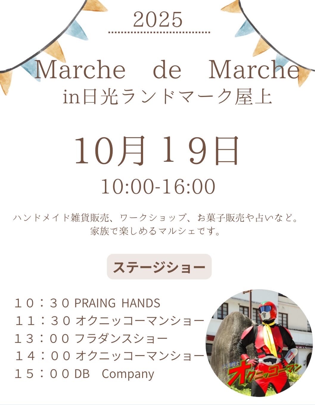 2025年10月19日、日光市今市の「日光ランドマーク」屋上にて、「Marche de Marche(マルシェ・ド・マルシェ)」。が開催されるとの情報をいただきました。