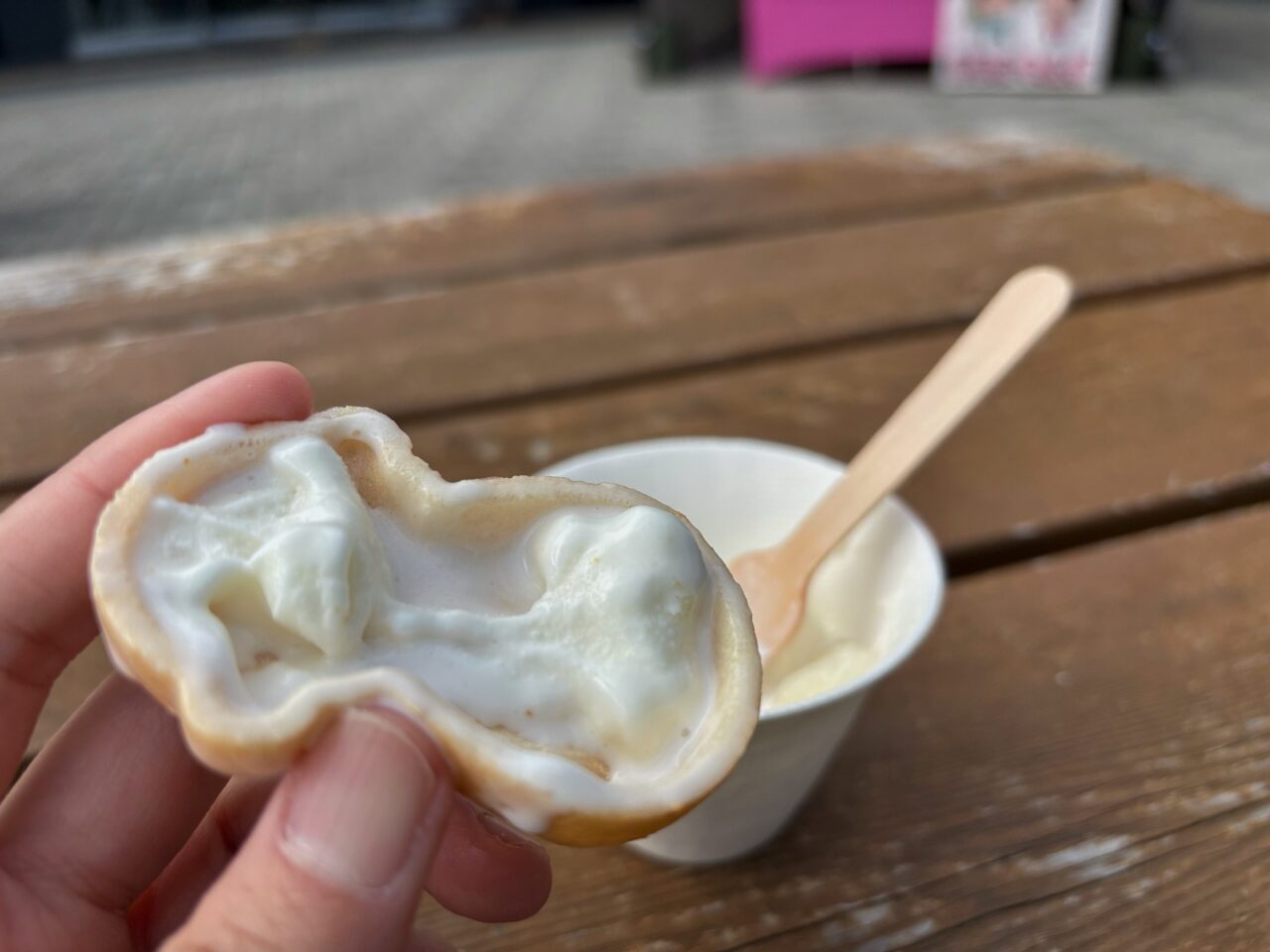 雪見大福のように、求肥はなめらかでジェラートとなじみやすく、さっぱりした味に口どけの良い感触です。最中との相性も抜群で、パリッと楽しめました。