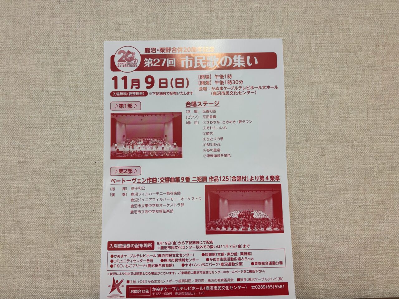 【鹿沼市】入場整理券配布中。鹿沼・粟野合併20周年「第27回 市民歌の集い」11/9開催されます。