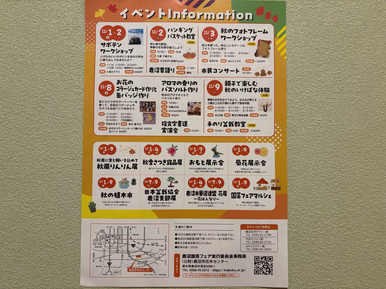 秋にふさわしい植物たちを一同に集めたイベントです。「秋季さつき銘品展」「おもと展」「菊花展示会」「日本盆栽協会鹿沼支部展」「鹿沼市華道連盟 花展」を予定しています。展示だけではなく、ワークショップや体験教室、マルシェも開催されるようです。