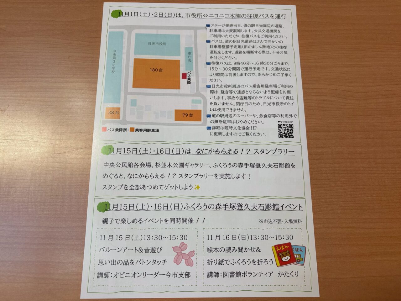 友だち同士やご家族でぜひ「日光市民文化祭(今市)」に出かけてみてはいかがでしょうか。11月1日(土)・2日(日)は、市役所とニコニコ本陣の往復バスが9:40~16:30頃まで15分~30分間隔で運行もあるようですよ。