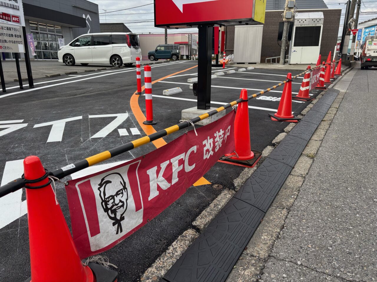 現地を確認したところ、店舗には「KFC 改装中」と書かれた横断幕が掲げられ、敷地内には入れないようになっていました。