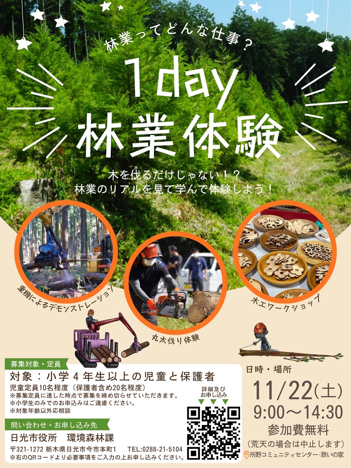 2025年11月22日(土)、日光市で親子で楽しめる「林業体験イベント」が開催されるとの情報をいただきました。