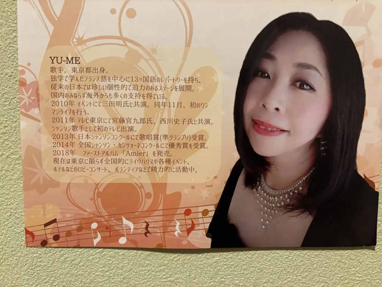 歌手のYU-MEさんが、シャンソンから世界の名曲までノンジャンルでお届けするプチコンサートです。独学で学んだフランス語を中心に、13ヶ国語のレパートリーを持ち、従来の日本では珍しい個性的で迫力あるステージを展開されるとのこと。心に響く歌声で、日常の疲れをほっと癒してくれる時間になること間違いなし。入場料無料で楽しめます。