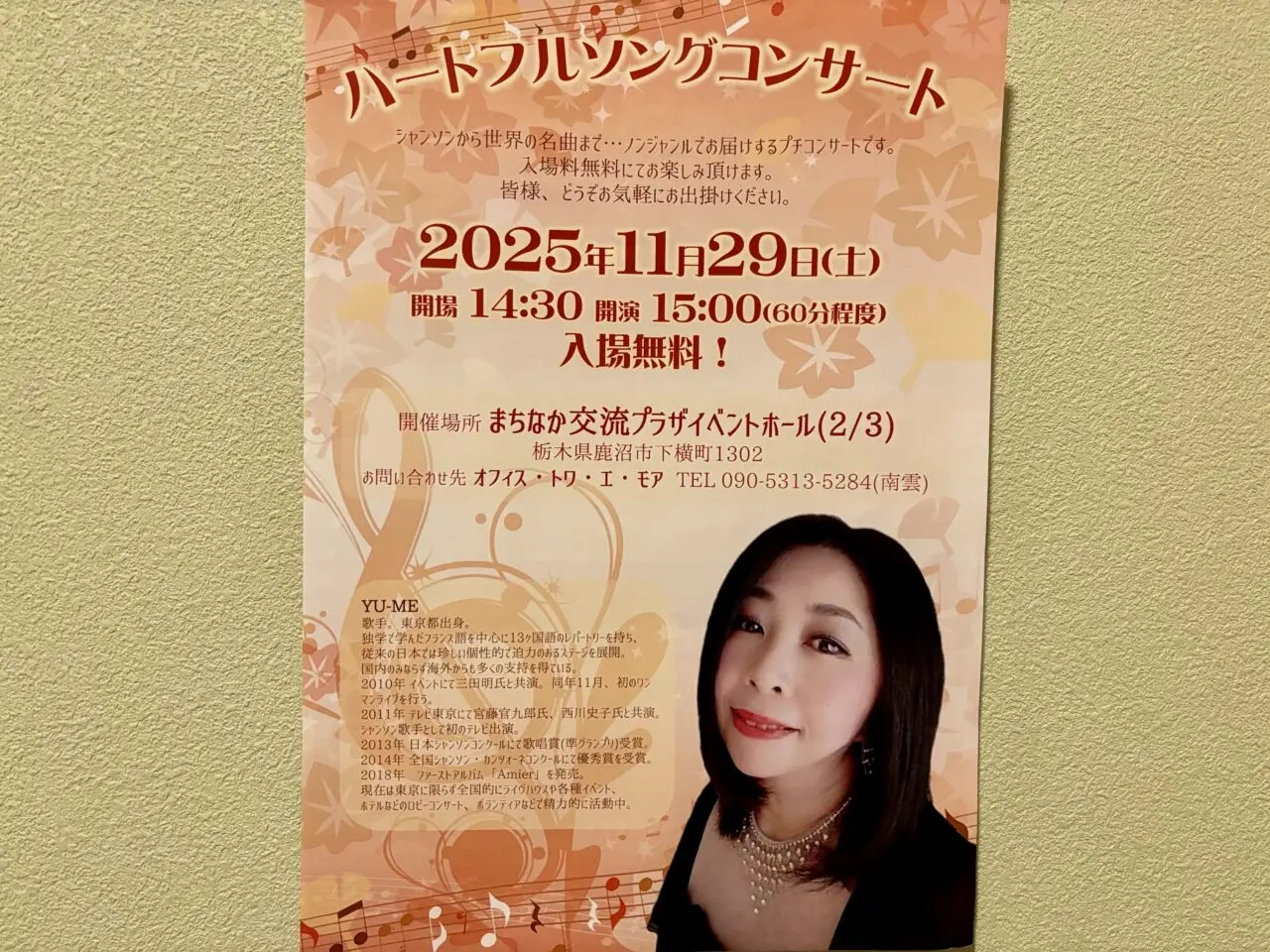 2025年11月29日(土)、鹿沼市下横町のまちなか交流プラザイベントホールで「ハートフルソングコンサート」が開催されることがわかりました。