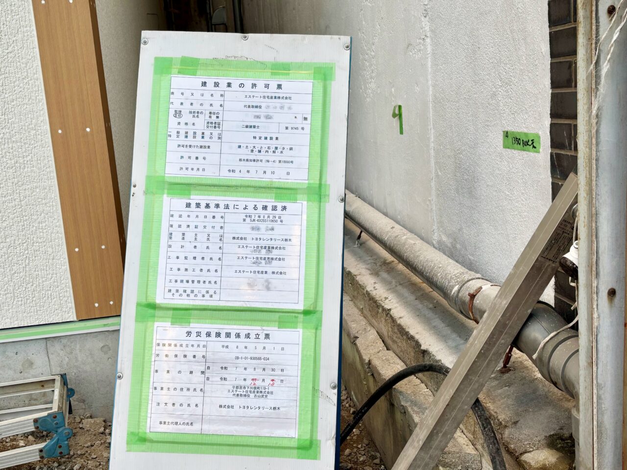 敷地内には「建設業の許可票」「建築基準法による確認済」「労災保険関係成立票」が掲示されており、そちらに記載されていた建築主は 株式会社トヨタレンタリース栃木。工事期間は当初、令和7年11月7日まででしたが、二重線で訂正され、令和7年12月18日までに変更されていました。
