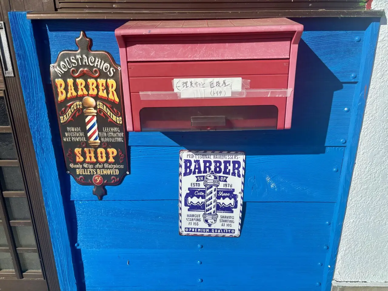 ポストには「理美サロン 匠技屋」と記載があり、あわせて「BARBER SHOP」と書かれたブリキ看板も掲示されています。。