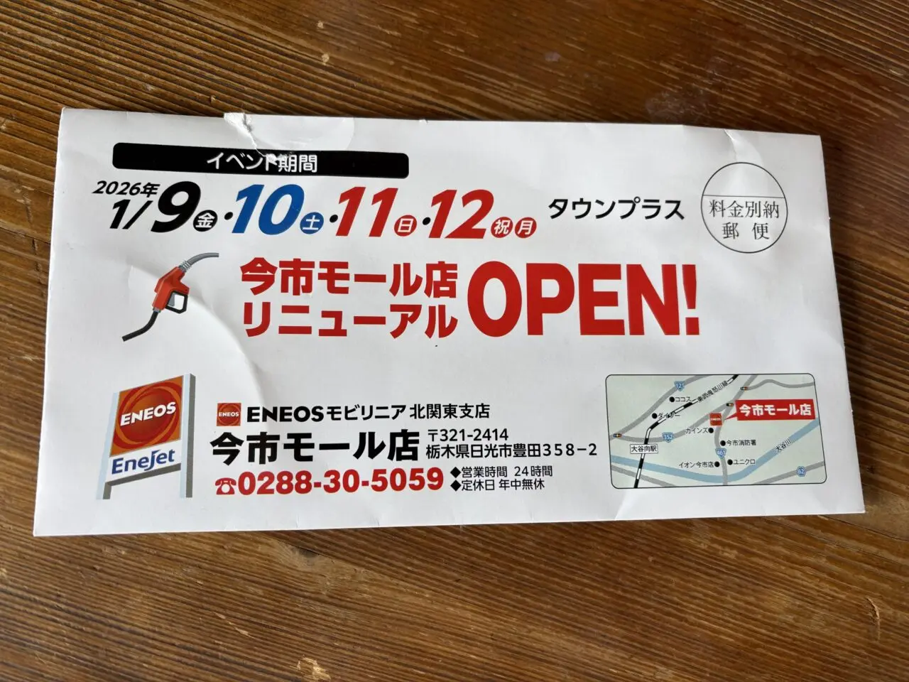 チラシには2026年1月9日(金)・10日(土)・11日(日)・12日(月・祝)に今市モール店 リニューアルOPENと記載があり、オープンイベントが行われます。