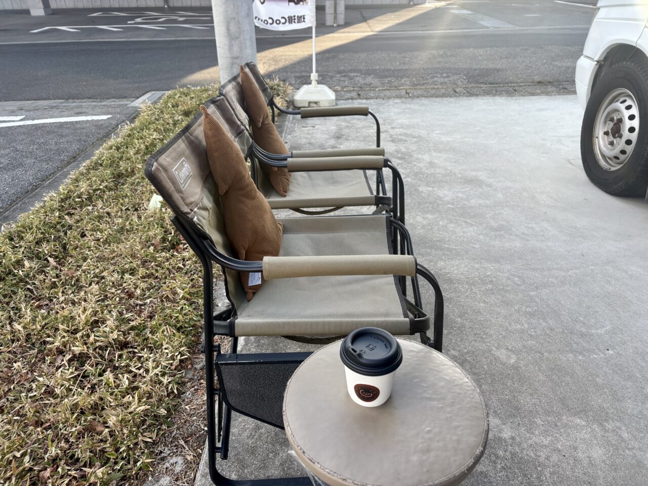 キッチンカーの前にはイスも用意されており、座って食べることもできます。天気の良い日には、ちょっとしたピクニック気分も楽しめそうですね。