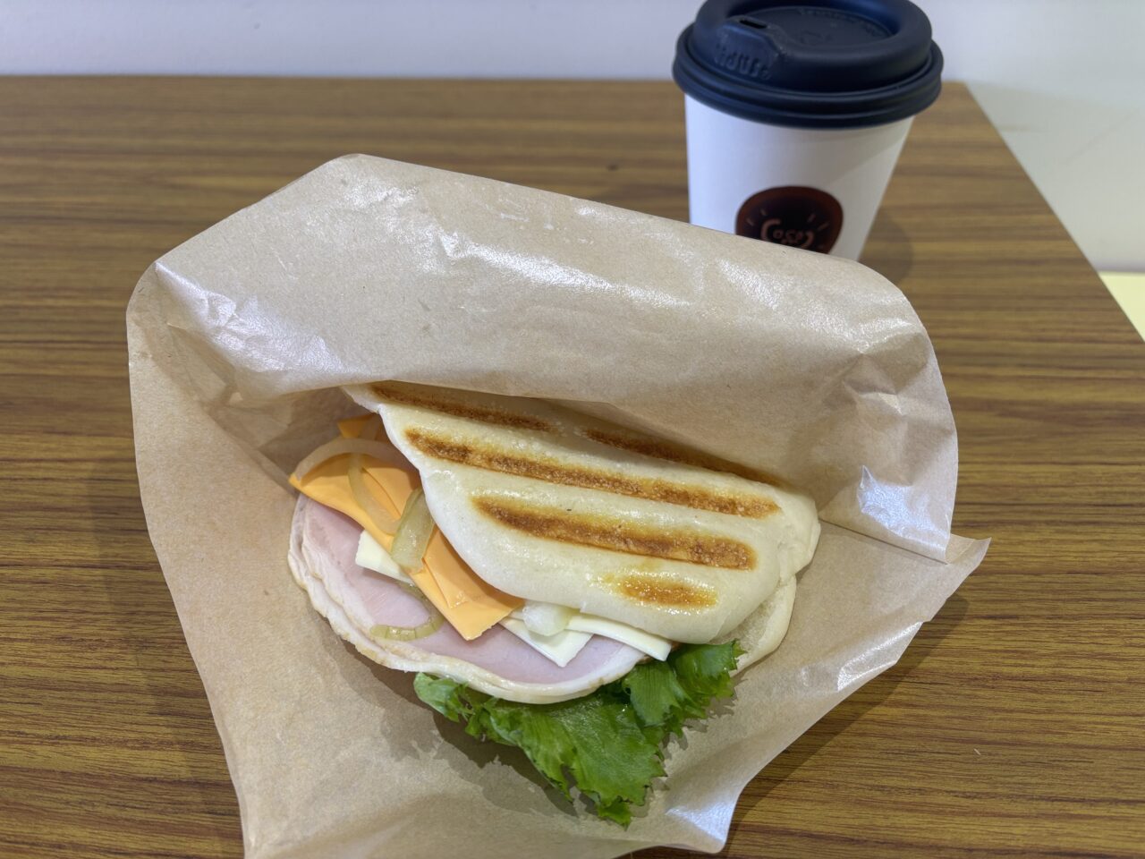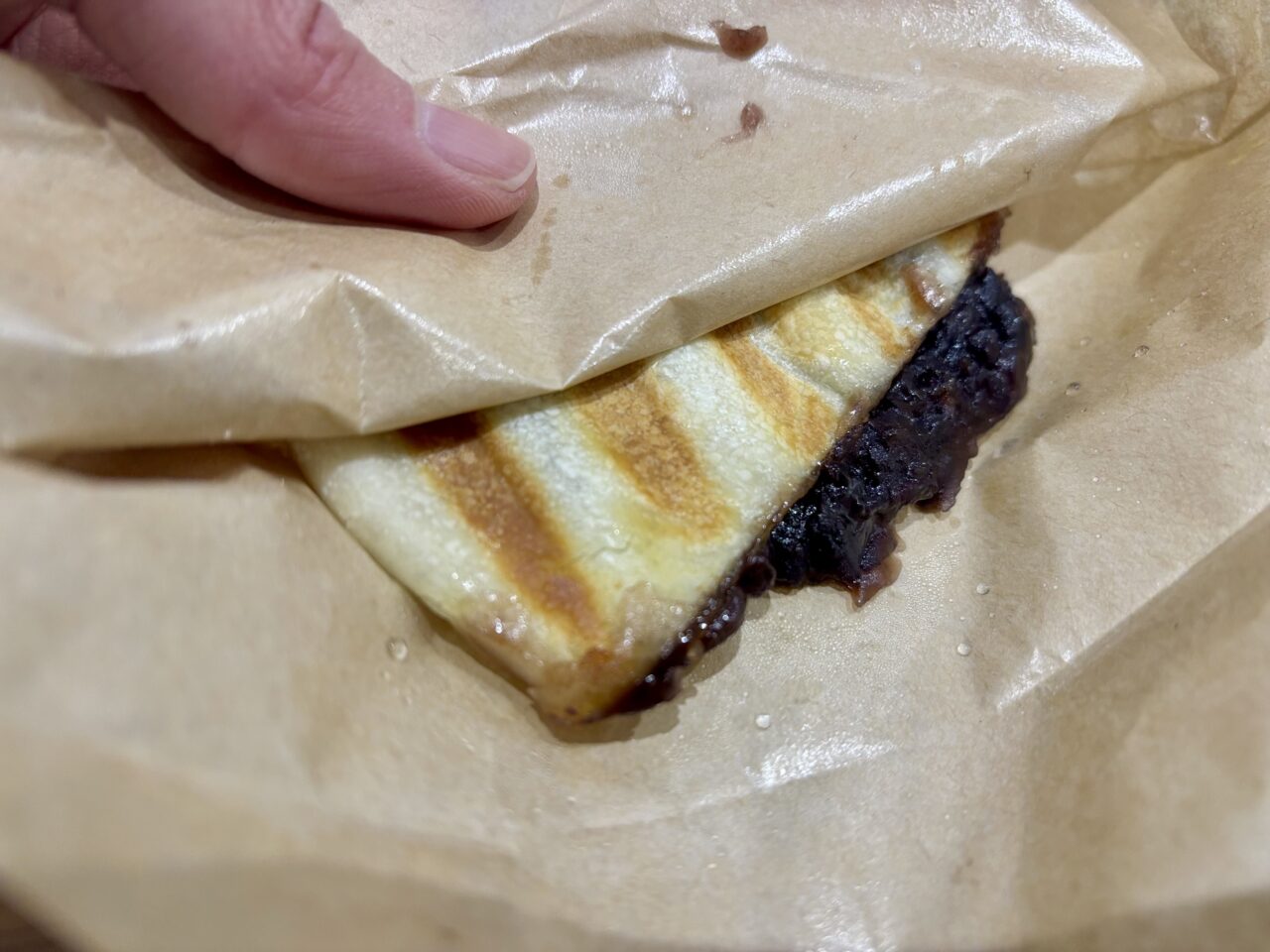 訪れた日は、きまぐれパニーニ「生ハムとクリームチーズ」が用意されていました。そのほか、スイーツ系の「あんこパニーニ」や、食事系の「ハムと2種チーズ」もありました。
