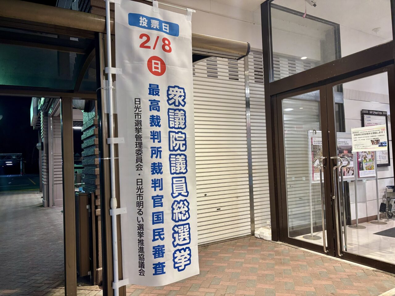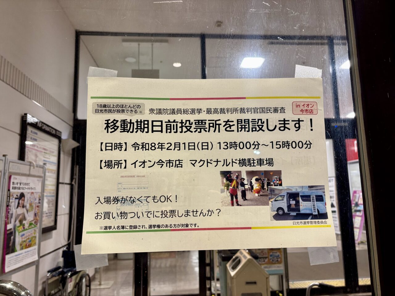 2026年2月1日(日)13:00~15:00の間、イオン 今市店のマクドナルド横の駐車場に「移動期日前投票所」が設置されることが分かりました。