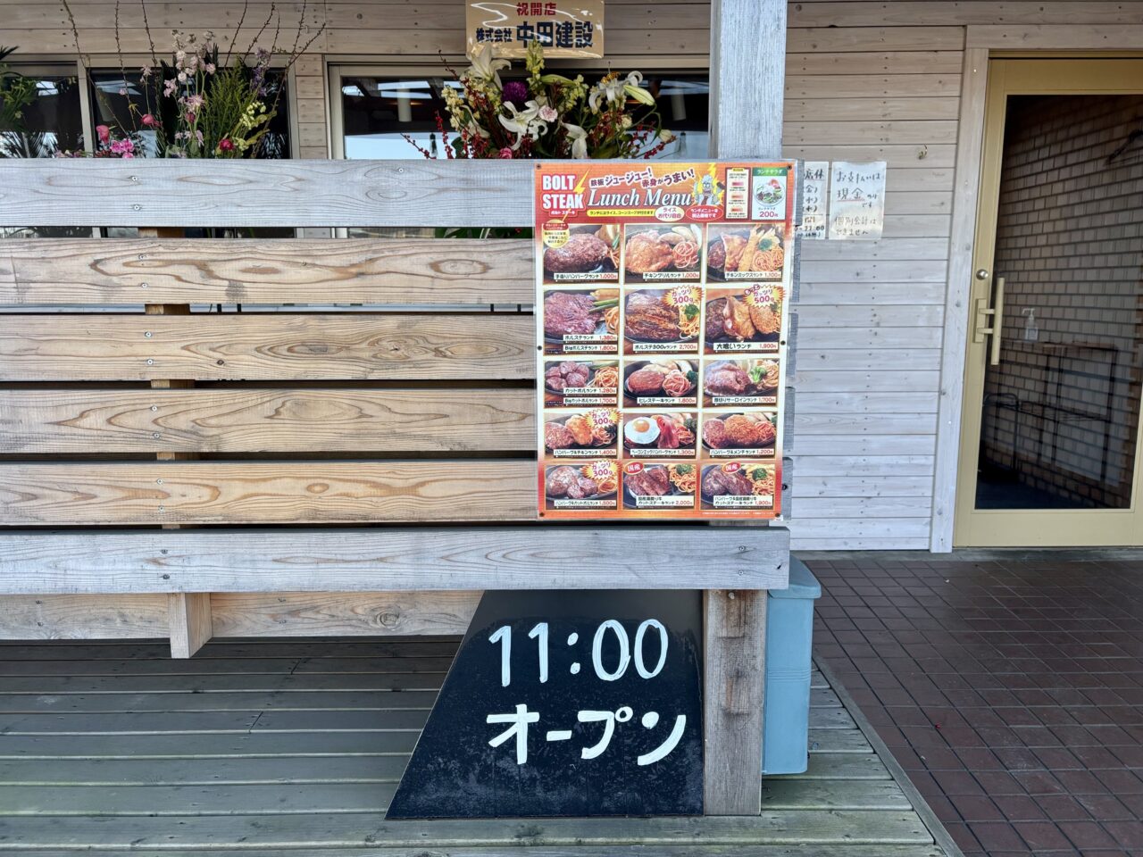 入口には「11:00オープン」の案内とメニューが掲示されていました。メニューを確認すると、ハンバーグやステーキなど、肉料理が中心のラインナップ。がっつりお肉を楽しみたい方には嬉しいお店になりそうです。