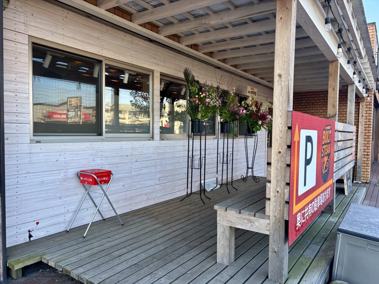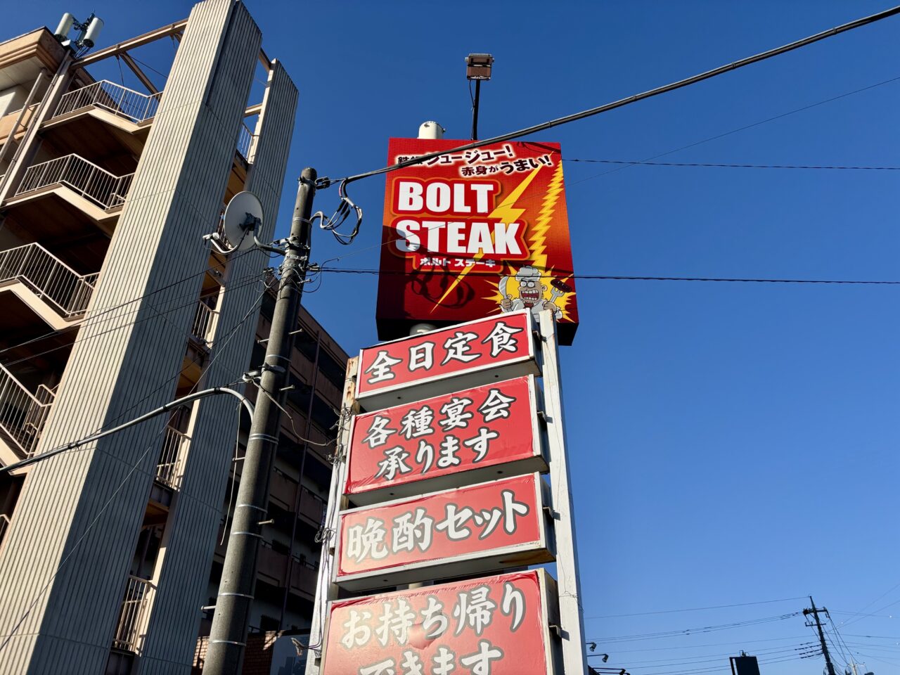「鉄板ジュージュー!赤身がうまい!BOLT STEAK」と書かれたポール看板も設置されており、存在感は抜群。