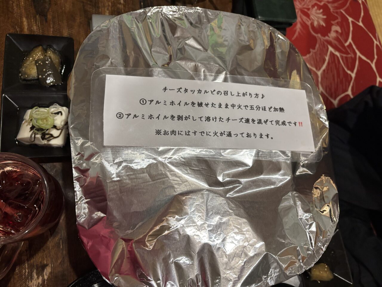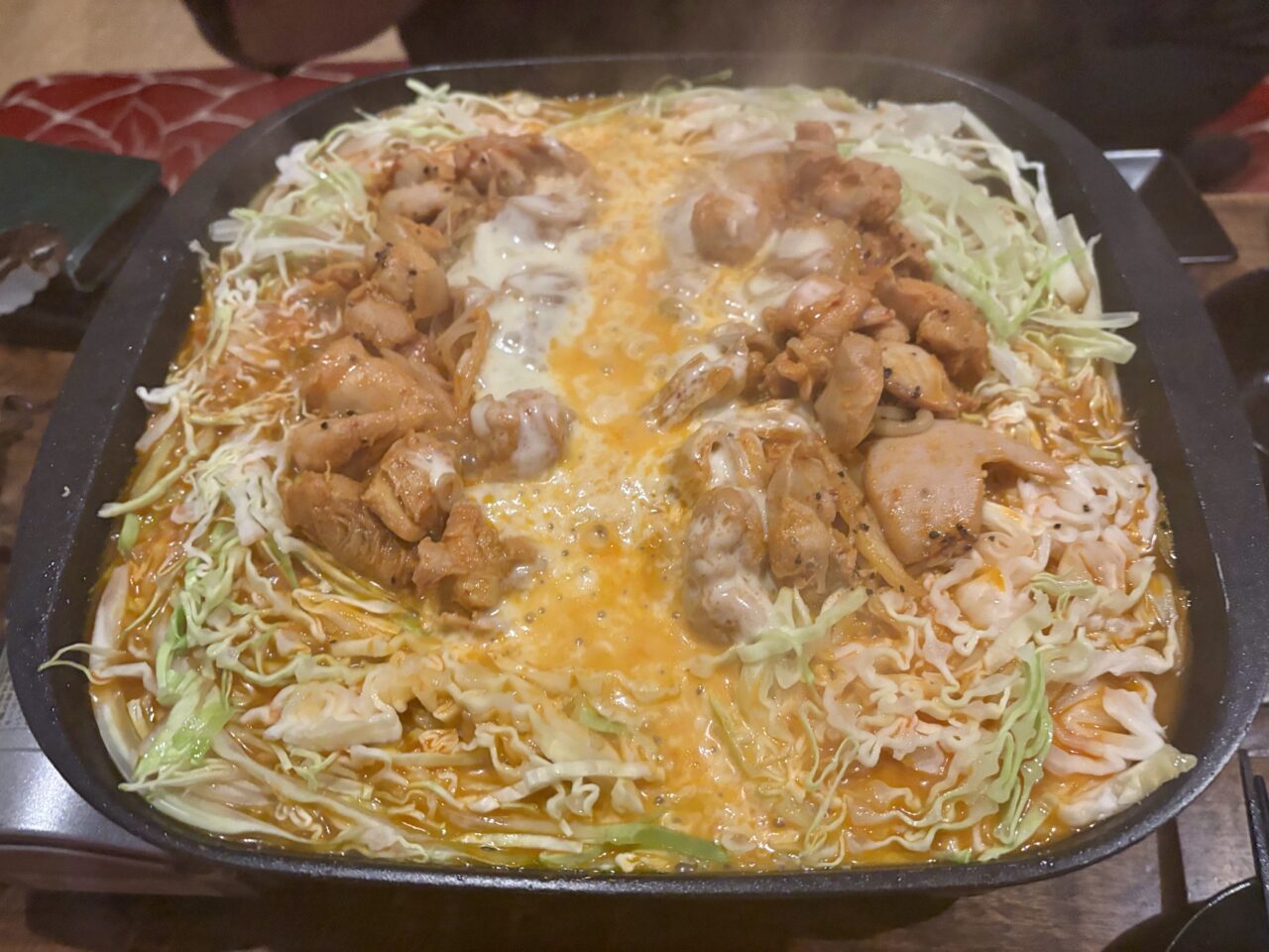 しばらくするとぐつぐつと煮え始め、お肉とキャベツがよく馴染み、とろけたチーズが食欲をそそります。チーズのコクとピリ辛のお肉がよく合い、ついつい箸もお酒も進みました。
