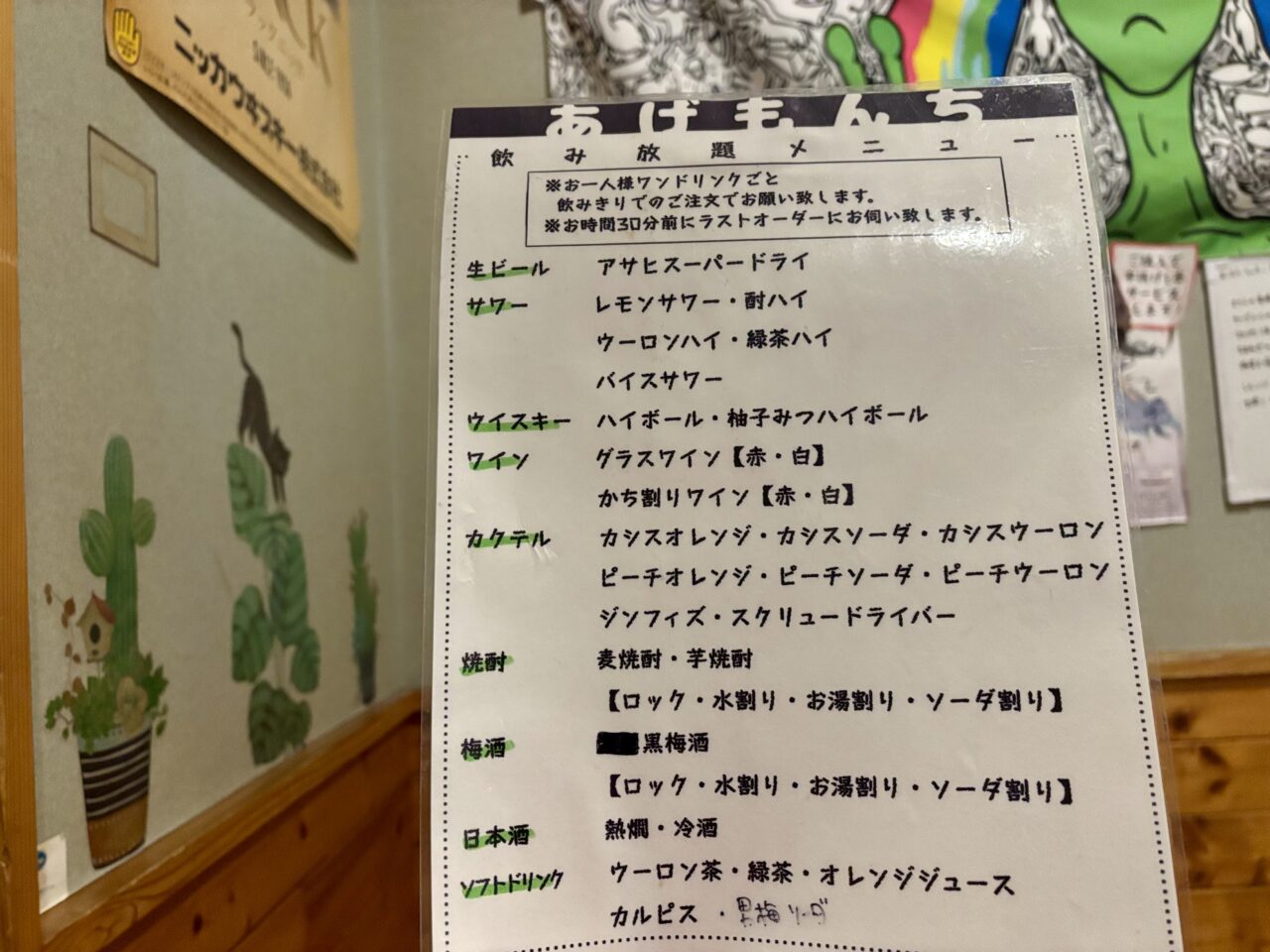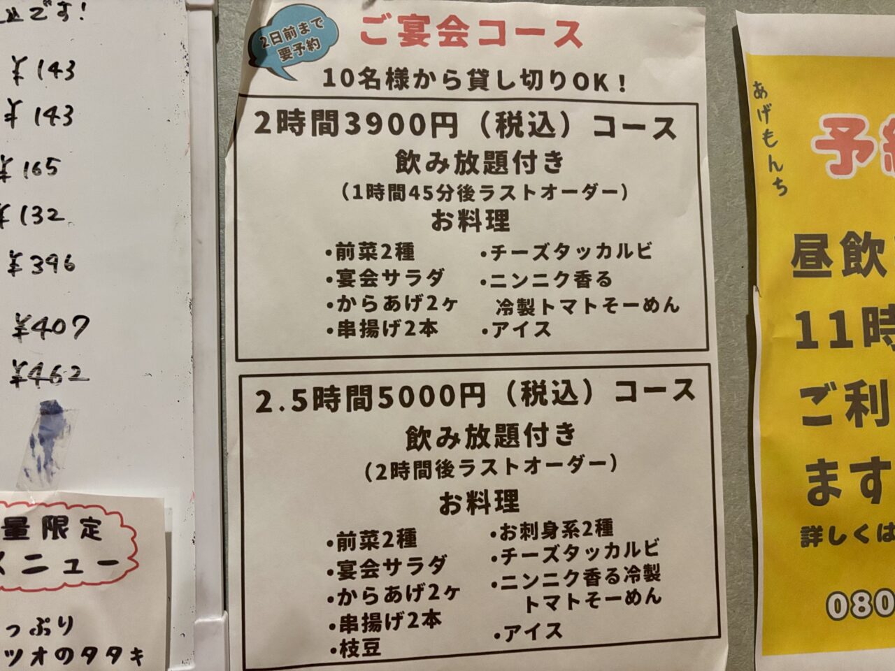 利用したのは、2時間飲み放題付きの宴会コース(3,900円・税込)です。飲み放題は、生ビール、サワー、ウイスキー、ワイン、カクテル、焼酎、梅酒、日本酒、ソフトドリンクなど充実したラインナップでした。
