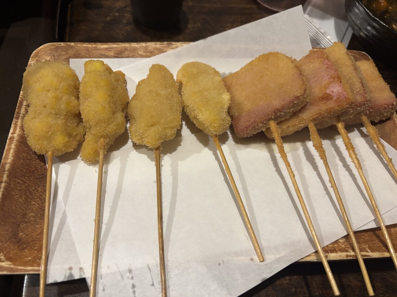 「串揚げ」は、コーンとベーコンの2種類でした。衣が細かくサクサクとした食感で、いくつでも食べられそうなおいしさです。