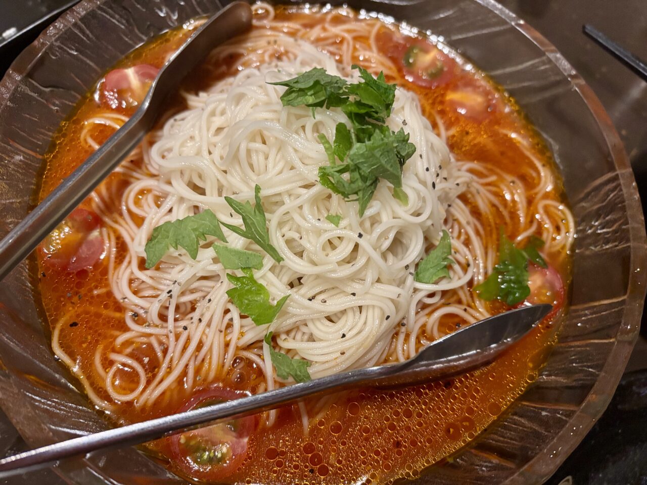「冷製トマトそーめん」はさっぱりとしていて、トマトとそーめんの相性もよく、〆にぴったりの一品。