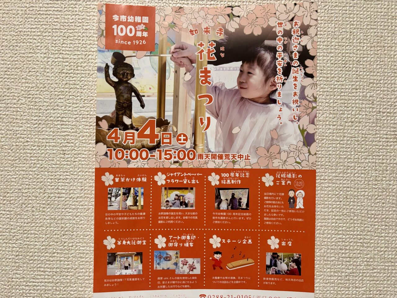 お釈迦様の誕生を祝い、世の中の平安を願う「花まつり」が開催されます。日光市今市にある浄土宗 星顕山 光明院 如来寺で行われるイベントです。同寺が運営する「今市幼稚園」の創立100周年を記念し、絵画制作が行われる予定とのこと。