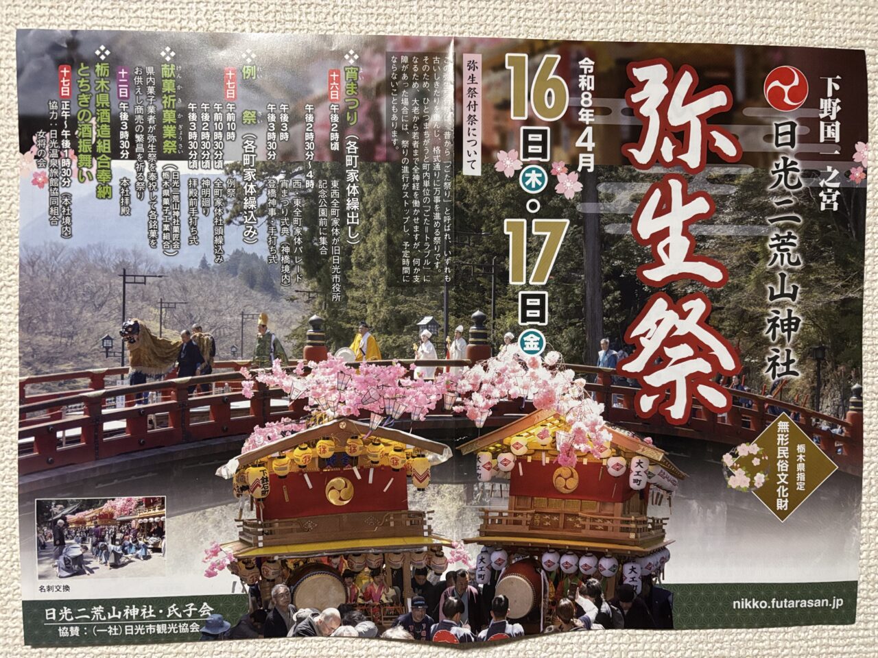 今年2026年も4月16日(木)・17日(金)に日光二荒山神社「弥生祭」が行われます。色とりどりに飾られた各町内の花家体(はなやたい)がお囃子と共に、日光地域の市街を練り歩き賑やかなお祭りになりそうです。