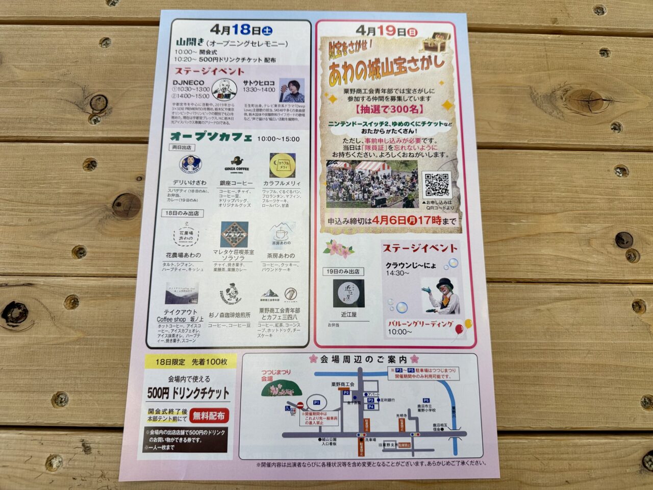 財宝をさがせ!あわの城山宝さがしが予定されています。こちらは事前申込制で、すでに募集は締め切られています。近江屋 お弁当の出店もあるようです。