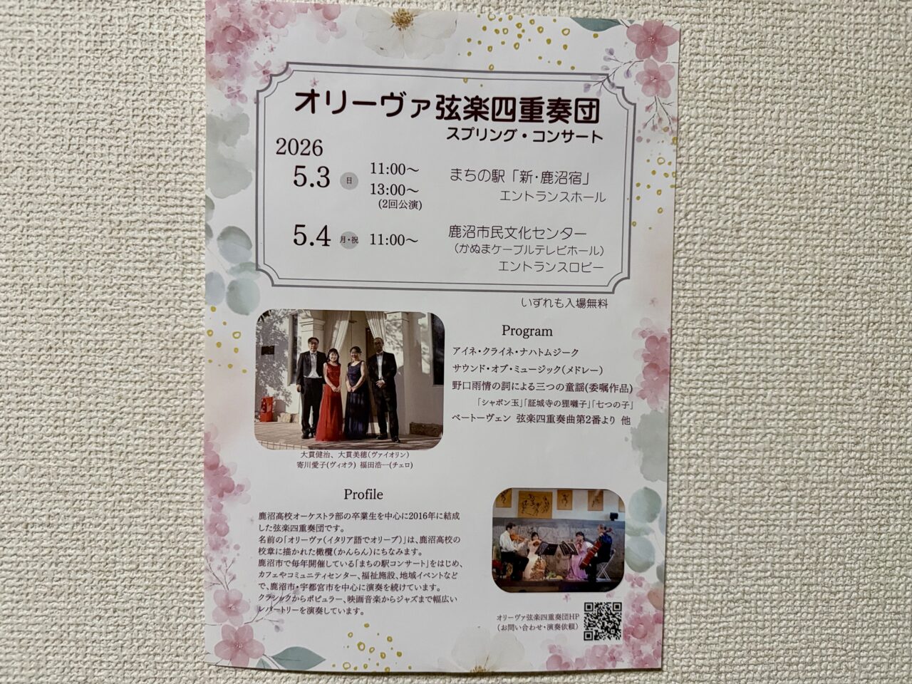 【鹿沼市】入場無料で楽しめる♪オリーヴァ弦楽四重奏団のスプリング・コンサートが5月3日・4日に開催されます
