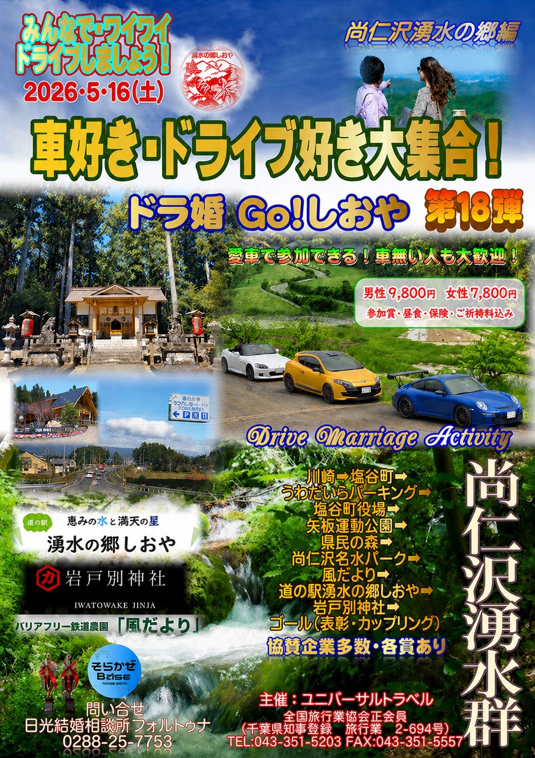 栃木県塩谷町で、「ドラ婚 Go! しおや」が開催されると情報をいただきました。ドライブを楽しみながら交流できるイベントで、2026年5月16日(土)に行われます。塩谷町は、日光市のお隣に位置する自然豊かな町。名水百選にも選ばれている「尚仁沢湧水」などでも知られています。第18弾となる「ドラ婚」イベント。これまでも場所を変えて開催されてきました。前回は日光市で実施され、今回は塩谷町で初開催となるそうです。
